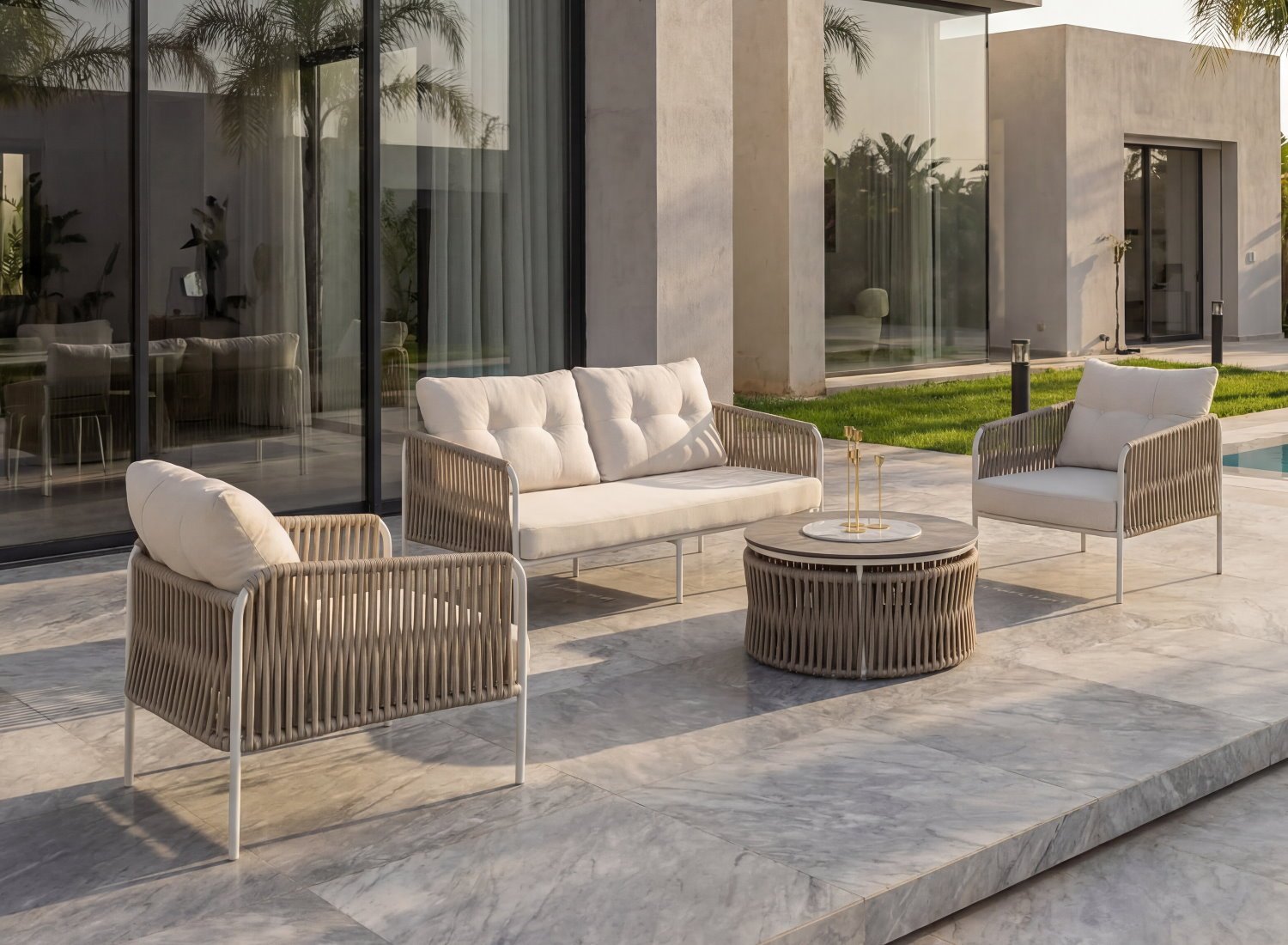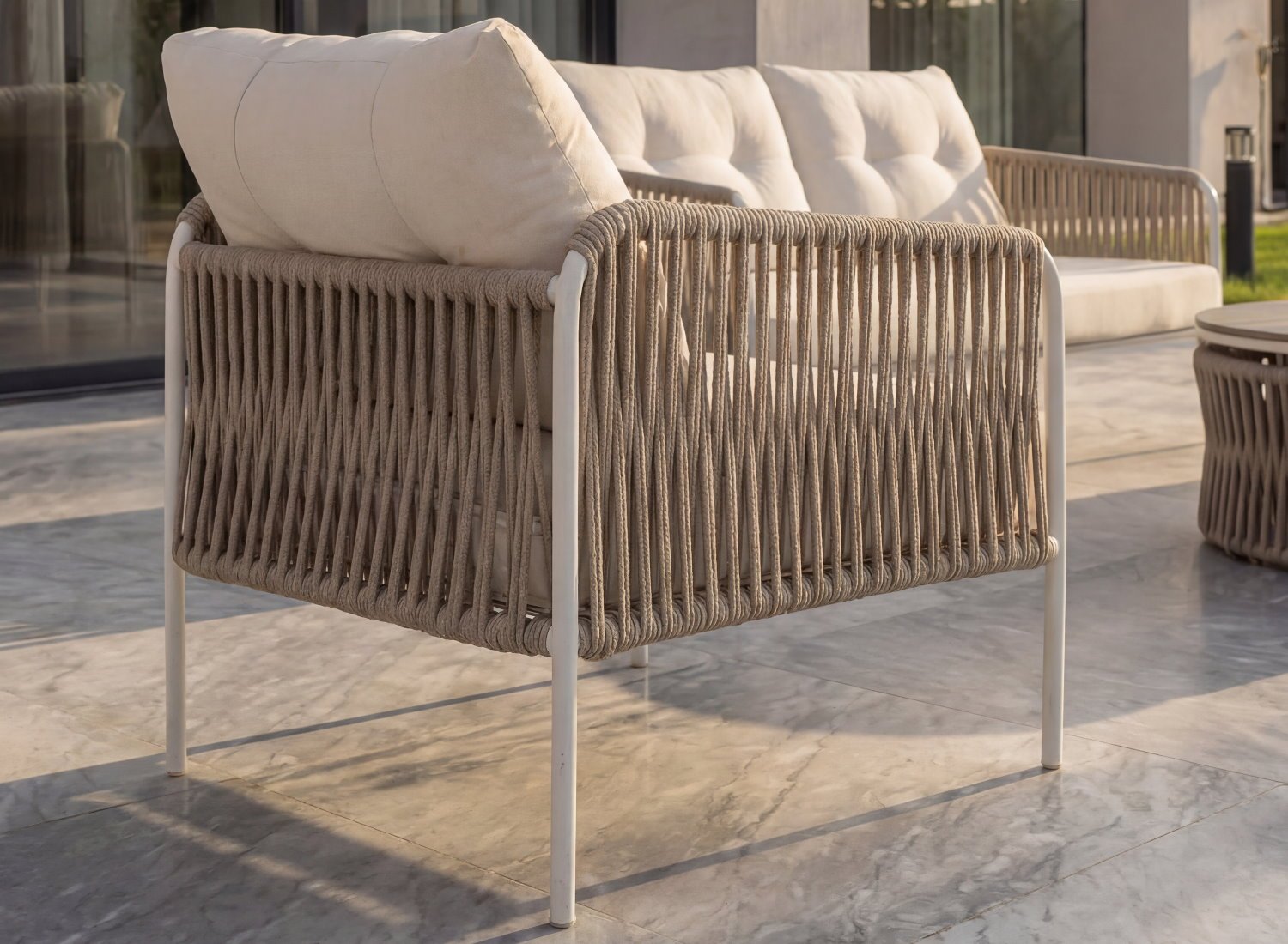 La structure du salon repose sur un tressage en corde technique extérieure, soigneusement sélectionnée pour sa résistance aux UV, à l’humidité et aux variations climatiques. Cette corde tressée haut de gamme assure une excellente tenue dans le temps tout en apportant une esthétique chaleureuse et naturelle. Son toucher doux et sa flexibilité améliorent le confort des assises, tout en conservant une solidité structurelle adaptée à un usage intensif en extérieur.