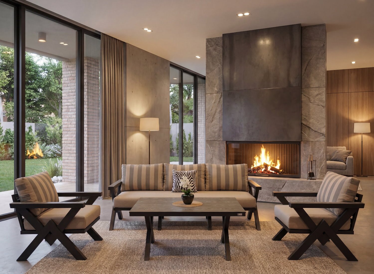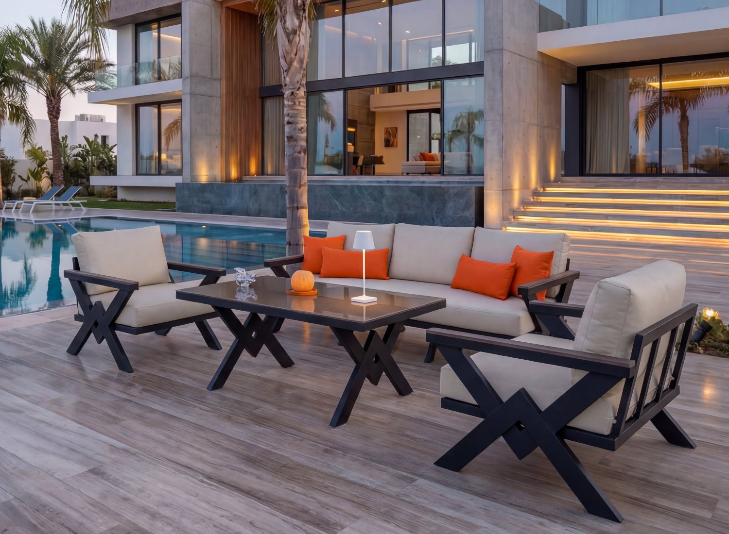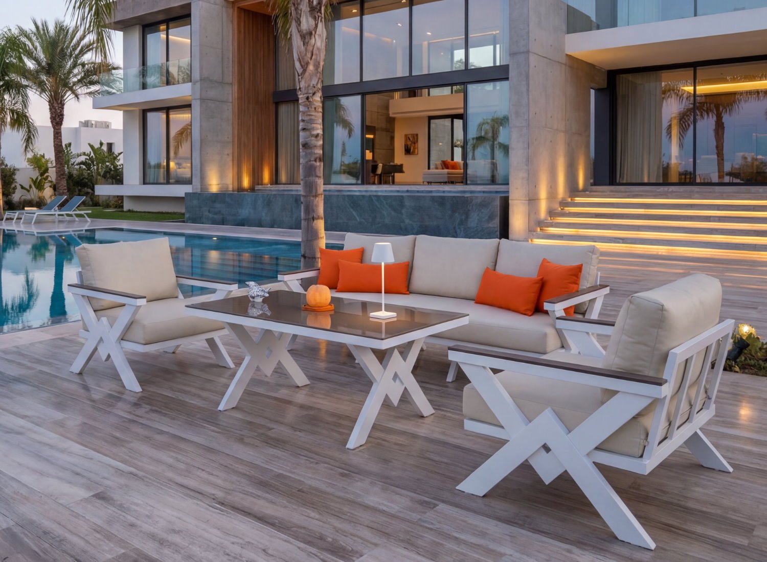 Un salon extérieur au design structuré et contemporain, conçu pour allier style, fonctionnalité et durabilité