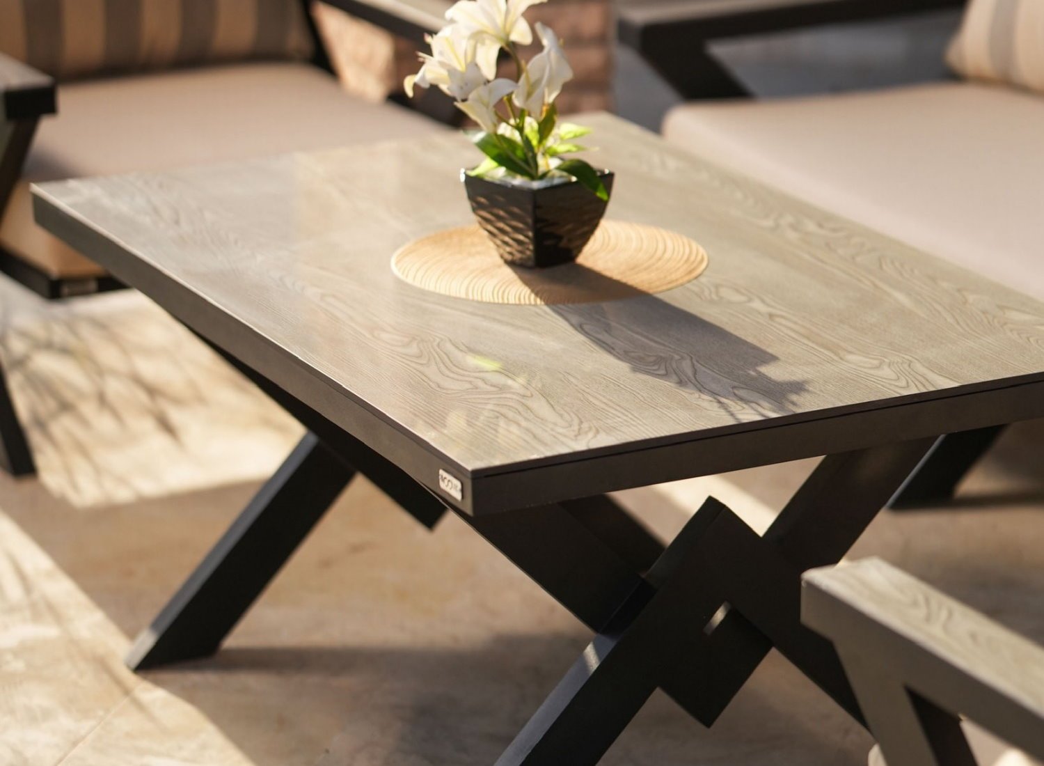 Le Salon Miami en HPL incarne une élégance architecturale affirmée, pensée pour sublimer les extérieurs contemporains. Son design se distingue immédiatement par ses pieds en V croisés, signature esthétique forte qui apporte à la fois caractère visuel et stabilité remarquable. Inspiré des lignes modernes des villas de prestige, le salon Miami crée une atmosphère chaleureuse et raffinée autour de la piscine ou sur une grande terrasse.