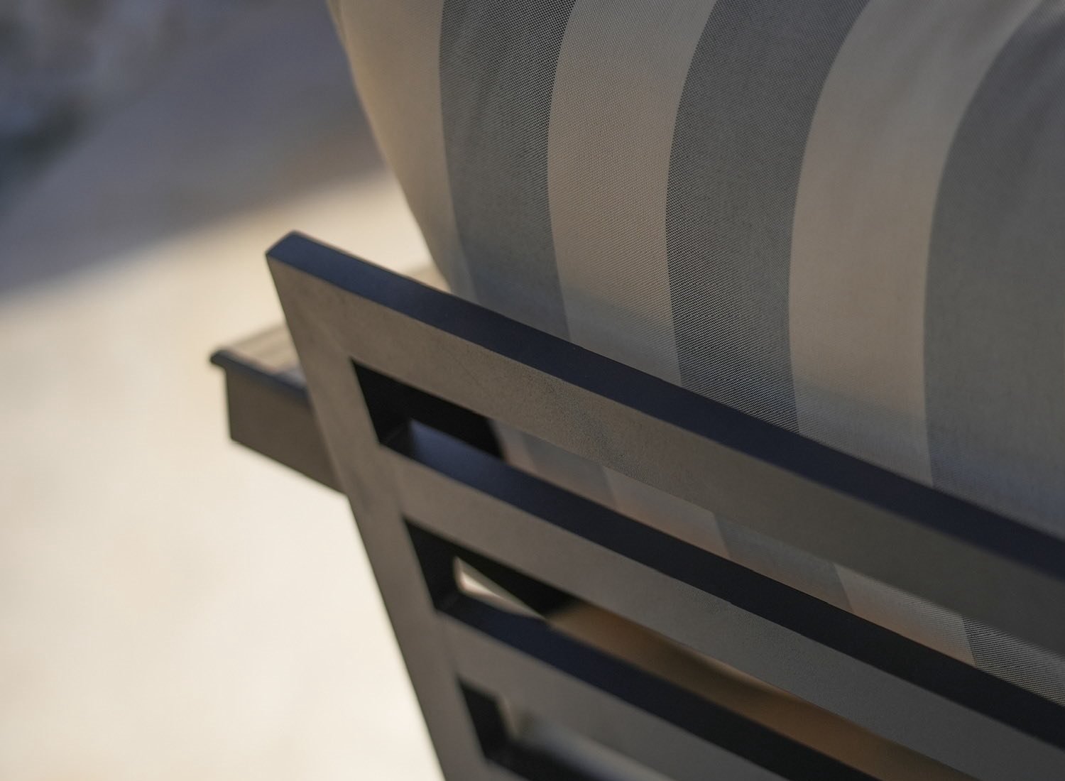 La structure en aluminium thermolaqué époxy au four garantit une excellente résistance aux intempéries, à l’humidité et aux rayons UV, tout en conservant une finition élégante et durable. Les dossiers en tôle travaillée renforcent l’aspect graphique du salon et assurent un maintien solide.