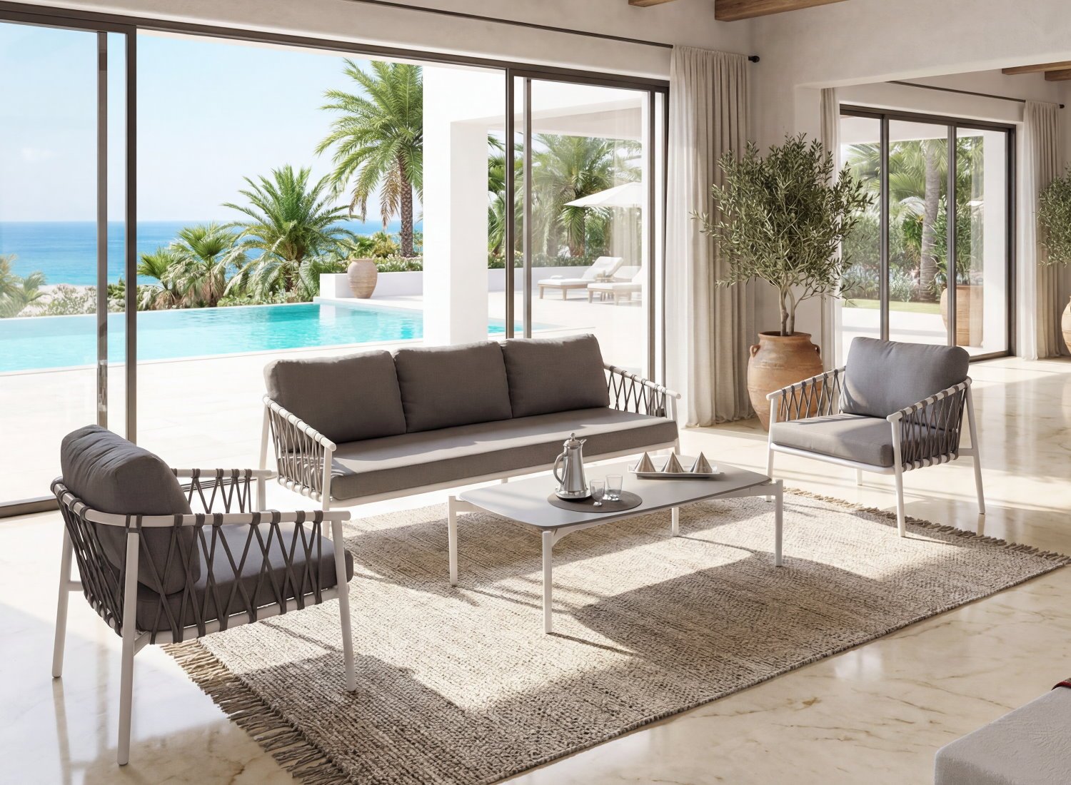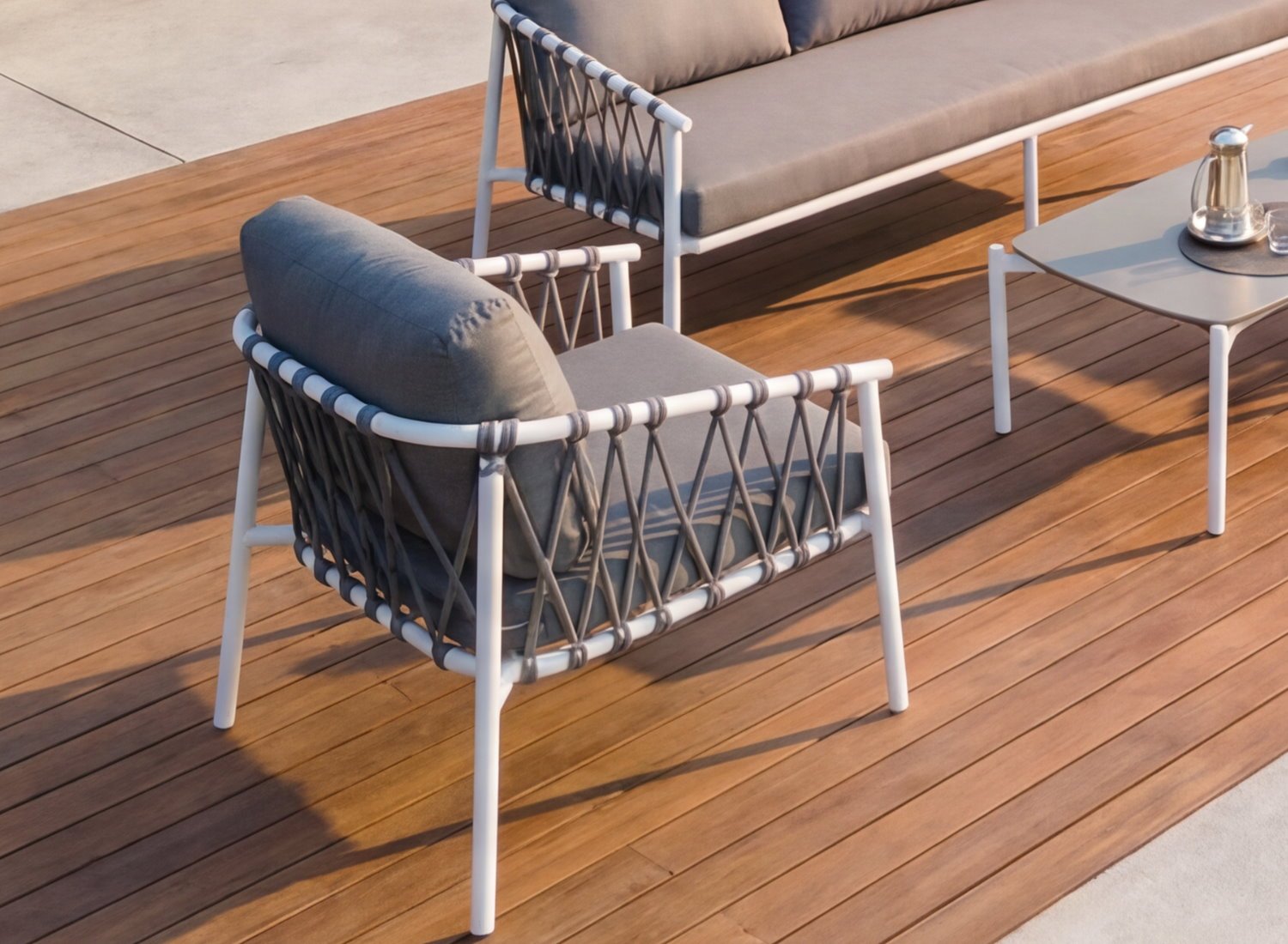 Le Salon TENDeNCE se distingue par l’utilisation d’une corde tressée haute performance, pensée pour offrir à la fois esthétique contemporaine et résistance extrême. Chaque tressage est réalisé avec précision pour créer une structure à la fois légère visuellement et solide à l’usage.