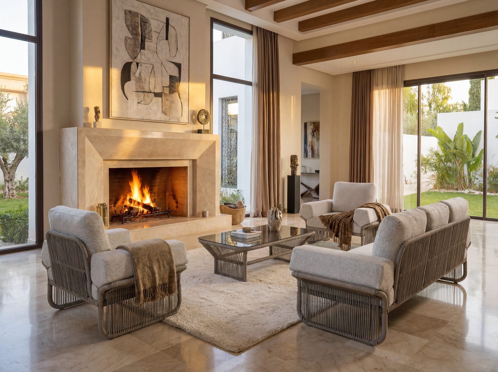 Au cœur de l’ensemble, la table centrale à hauteur étudiée, plus élevée qu’une table basse classique, constitue un véritable atout fonctionnel. Elle permet de prendre les repas confortablement tout en restant assis dans les fauteuils, sans compromettre la détente. Sa conception transforme le salon VICTORIA en un espace de vie polyvalent, idéal pour les repas, les échanges et les moments de partage.