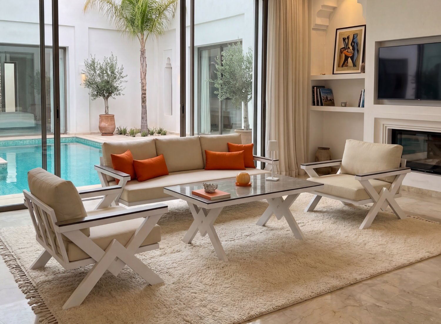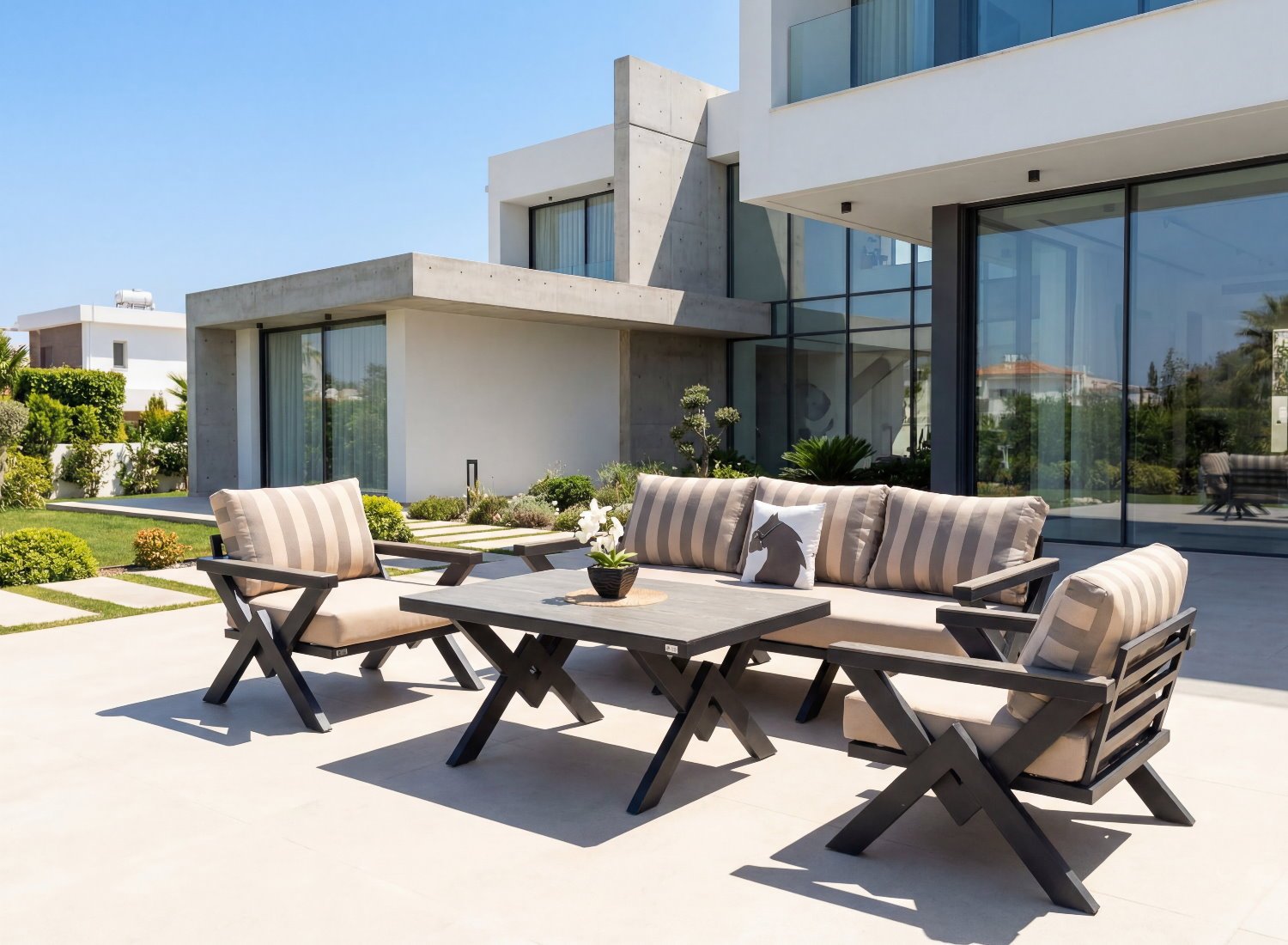 Un salon extérieur au design structuré et contemporain, conçu pour allier style, fonctionnalité et durabilité