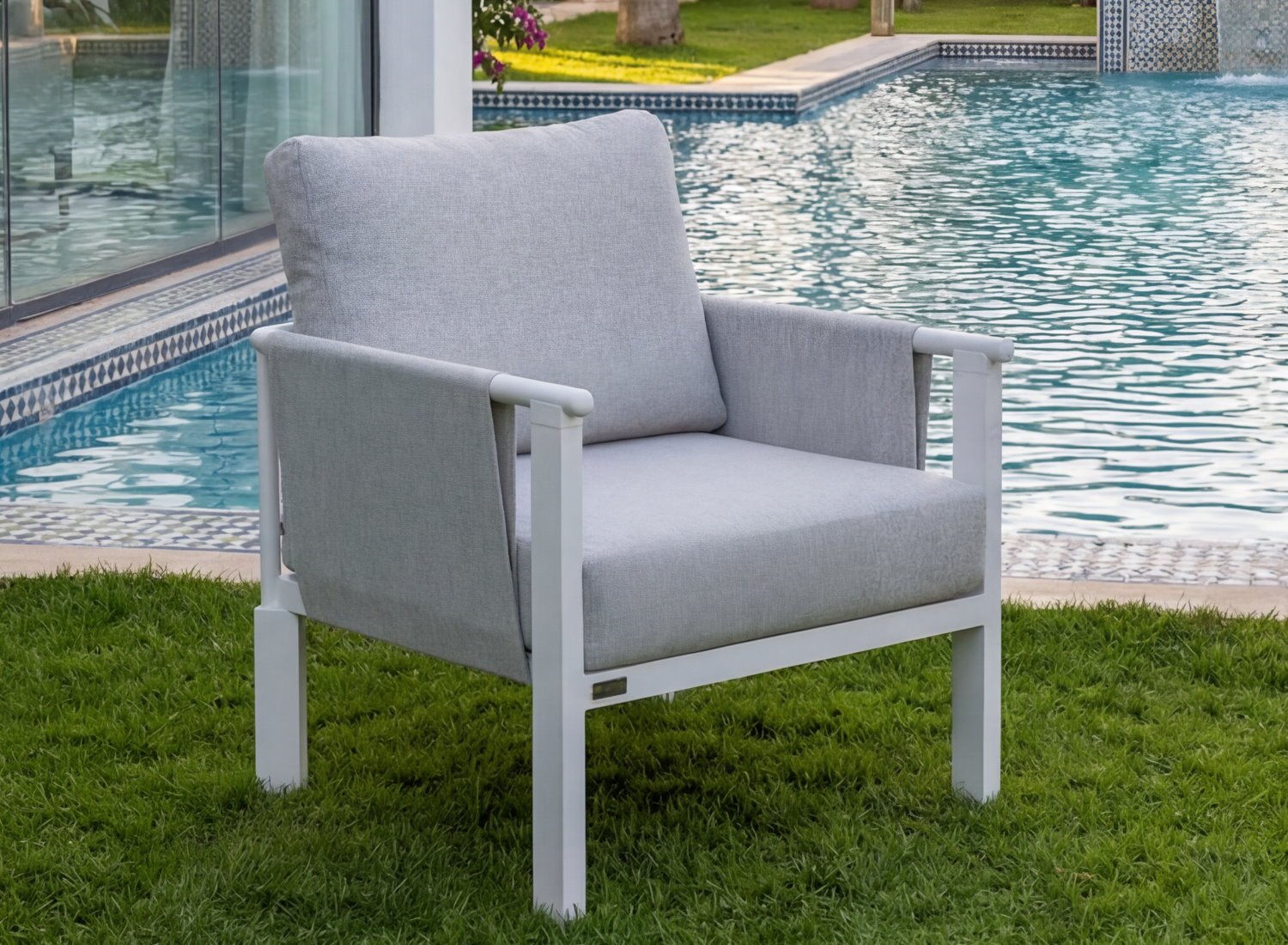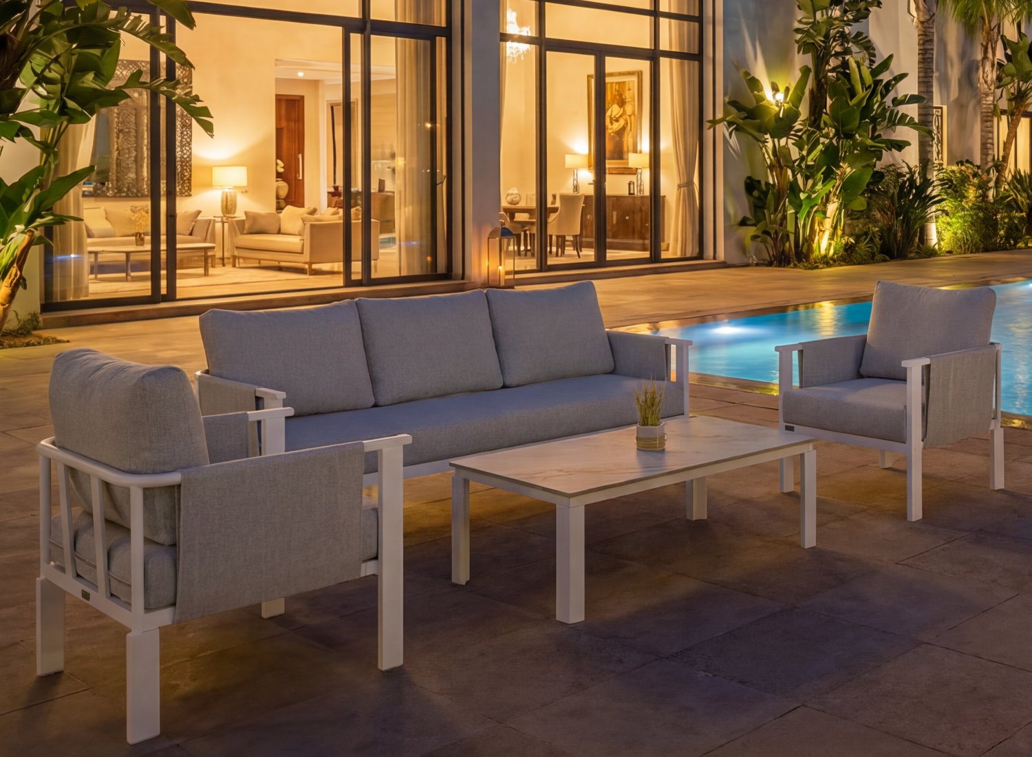 Le salon PATAYA se compose d’un canapé confortable et de fauteuils assortis, aux lignes épurées et aux proportions équilibrées. Sa structure en aluminium traité époxy et cuit au four assure une excellente résistance aux conditions extérieures, tout en conservant une finition soignée et durable. Son style moderne s’intègre naturellement sur une terrasse, dans un jardin ou au bord d’une piscine.