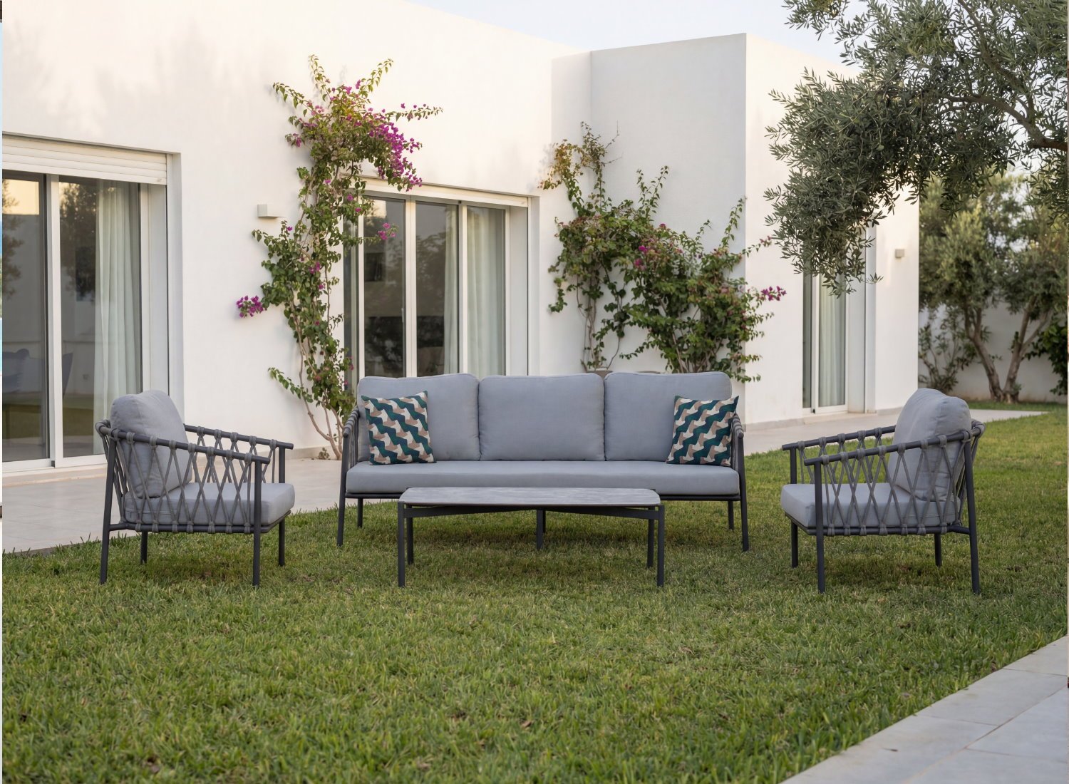 Le Salon TENDENCE incarne l’élégance moderne et la performance outdoor. Conçu avec une structure en aluminium robuste et habillé d’une corde tressée haute performance, il offre un équilibre parfait entre design contemporain et confort durable.
